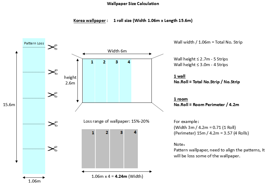 Korea | 1.06m width x 15.6m length per roll | 4.24m width x 3m height per roll |